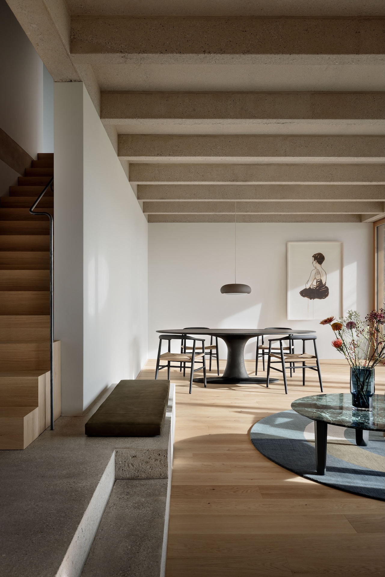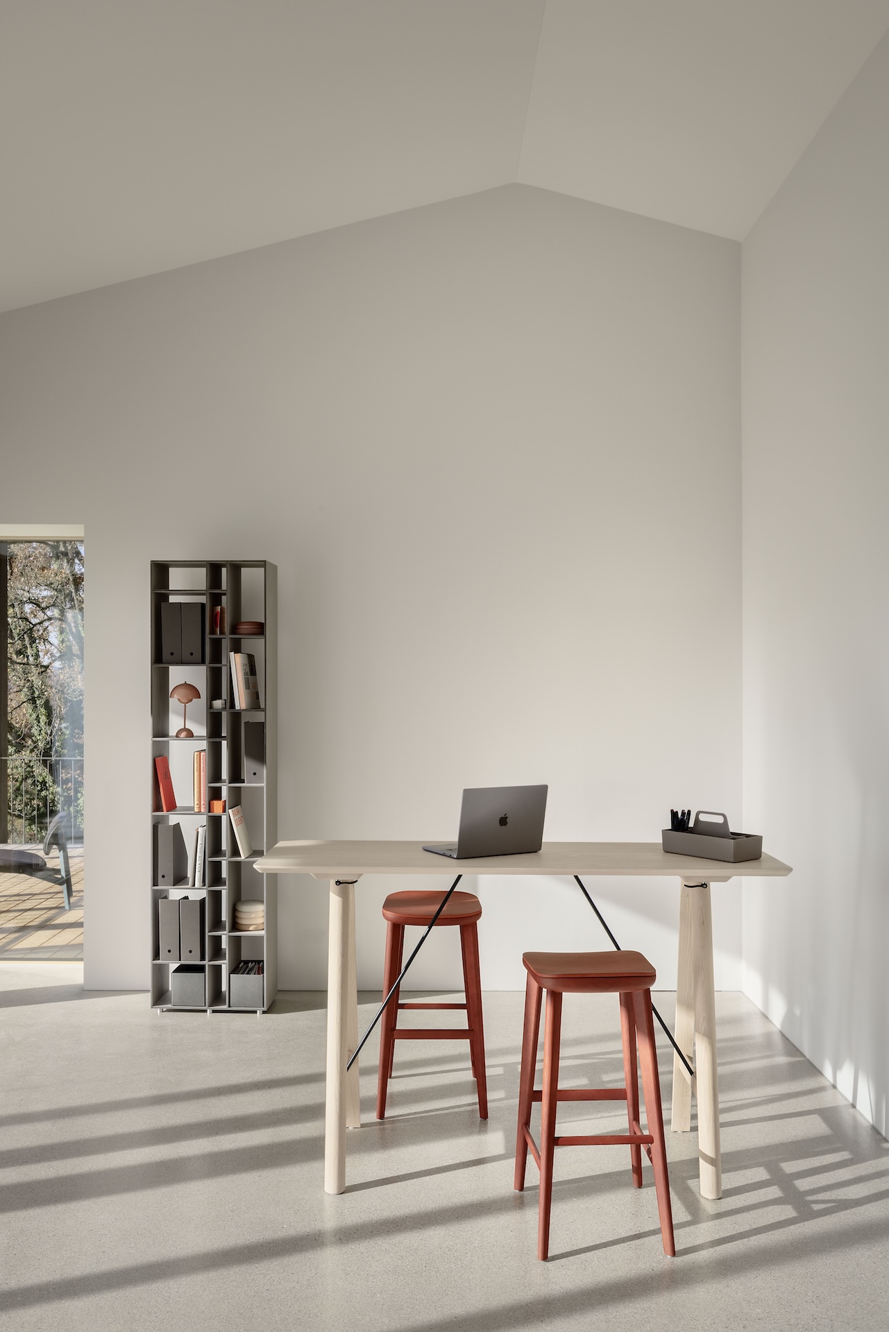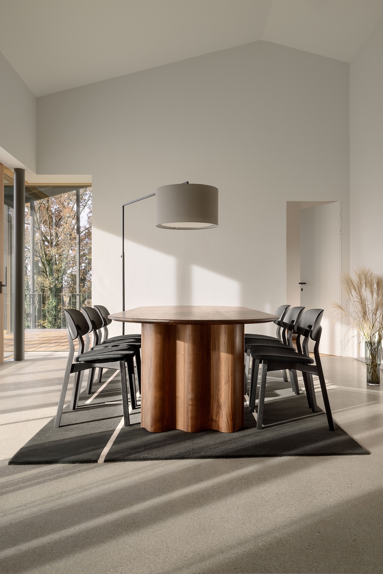 Within the historic rooms of the Odd Fellow Palace, a contemporary landscape of fabric and wood unfolds. Textile surfaces shape the architecture – creating openness, depth, and new lines of sight. ZEITRAUM invites visitors to experience furniture where reduction becomes precision, and craftsmanship brings vitality. Two new designs reflect this ongoing evolution: the SIT Webbing chair, with woven cotton belt, unites textile lightness with structural clarity. The high table TURNTABLE HIGH carries forward the essence of the original – archaic in form, refined in expression. An exhibition about what endures, when the visible fades and the feeling remains.